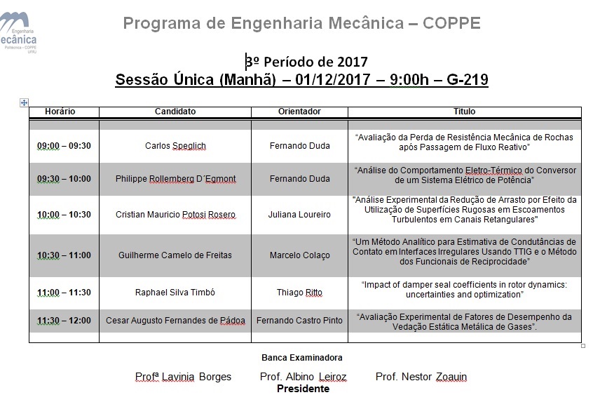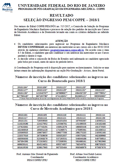 ATENÇÃO: A aprovação na fase de ANÁLISE DE PERTINÊNCIA E COMPLETUDE DOS DOCUMENTOS GERAIS E ACADÊMICOS não garante ingresso nos cursos oferecidos pelo Programa de Engenharia Mecânica da COPPE. Esse Ingresso está condicionado à fase de SELEÇÃO DOS CANDIDATOS cujo término está previsto para 22/12/2017.